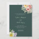 Découvrez notre magnifique faire-part de mariage moderne avec de belles fleurs pastel. Cette invitation présente une teinte foncée et sophistiquée de vert foncé, créant un look et une atmosphère luxueux. Les fleurs de couleur pastel dans les coins supérieur droit et inférieur gauche ajoutent une pop de couleur et d'élégance au design. Les fleurs du coin supérieur droit sont de couleur rose, jaune et violet, avec un vert clair et vert foncé. En revanche, les fleurs du coin inférieur gauche sont un beau mélange de violet et de vert d'olive, avec également de la verdure vert foncé. Ces éléments floraux se combinent pour créer une invitation unique et captivante, parfaite pour tout mariage. Le texte principal de l'invitation est dans une police de caractères blanc classique, fournissant un look propre et moderne. Les noms du couple, cependant, sont écrits dans une police de caractères vert moyen qui correspond parfaitement à la verdure de l'invitation, ajoutant une touche personnalisée au design. Cette faire-part de mariage moderne conviendra parfaitement à ceux qui souhaitent donner le ton à une célébration mariage sophistiquée et élégante. Le papier et l'impression de haute qualité assurent que l'invitation impressionne vos invités et qu'elle soit chère comme un souvenir pour les années à venir. Dans l'ensemble, ce faire-part de mariage aux fleurs pastel est un très beau choix qui allie éléments modernes et classiques, en faisant un design intemporel qui ne sortira jamais de son cachet.