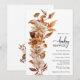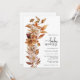 Faire-part de naissance automnal élégant. Ce faire-part de naissance élégant et rustique présente des feuilles de couleur orange brûlée et terracotta peintes à la main à l'aquarelle, des dahlias crème et beige, et de belles roses de couleur rouille parfaites pour un mariage automnal ! Le verso de l'invitation a un fond blanc simple avec un bouquet coordonné.