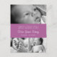 Trois photos sur le devant avec un bandeau violet orchidée avec les détails de naissance. Le dos a une mise en page de carte postale avec un message personnalisable et une photographie carrée. Cliquez sur "personnaliser" pour déplacer ou supprimer les éléments de la carte postale que vous ne voulez pas.