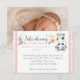 Veau adorable avec une couronne florale douce - le design parfait pour l'annonce de naissance de votre petite fille sur le thème de la vache ! Des pastels légers et doux accentués par un fond en bois blanc rustique. Une façon idéale de célébrer avec un style campagnard et shabby chic !