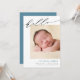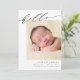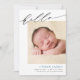 Partagez vos nouvelles joyeuses avec cette faire-part de naissance simple et moderne. La carte comporte un joli script qui dit "bonjour" en haut. Sous la calligraphie, ajoutez la photo de votre nouveau-né, le nom, les statistiques de naissance et vos noms. Le nom du bébé est écrit en bleu mais il peut être facilement changé si vous préférez une autre couleur. La couleur arrière - plan au dos de la carte est modifiable (en bleu) ; vous pouvez également ajouter des photos supplémentaires et un message personnalisé au dos si vous le souhaitez.