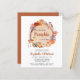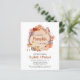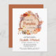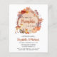 Invitation de fête prénatale automnale rustique et neutre pour couple à petit budget, avec une couronne aquarelle composée d'un tronc d'arbre, de mignons animaux de la forêt (hibou, cerf, écureuil et renard), de fleurs d'automne et de citrouilles. Un "Petit Trésor de Citrouille en Route" est écrit dans un mélange de typographie simple et d'écriture terracotta.