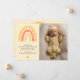 Bienvenue à votre petit soleil avec cette adorable carte faire-part de naissance ! Ce design animé est orné d'un arc-en-ciel joyeux, agrémenté de fleurs douces et de coeurs ludiques. La palette de couleurs jaune et corail crée une atmosphère chaleureuse et joyeuse, parfaite pour célébrer l'arrivée de votre précieuse fille. Idéal pour les bébés du printemps et de l'été ! Personnalisez la carte avec une photo de portrait vertical de votre nouveau-né et éditez facilement les modèles de texte pour une nouvelle carte de faire-part bébé personnalisée.