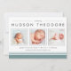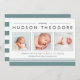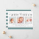 Annoncez l'arrivée de votre bébé sucré avec nos annonces de naissance de style collage moderne et neutre, avec trois de vos photos de nouveau-nés préférées au format carré, accentuées avec des polices de caractères modernes et des éléments rayés en noir et turquoise doux vert. Personnalisez avec le nom de votre bébé, les statistiques de naissance et le message de famille en utilisant les champs fournis.
