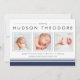 Annoncez l'arrivée de votre bébé sucré avec nos annonces de naissance de style collage moderne et neutre, avec trois de vos photos de nouveau-nés préférées au format carré, accentuées de polices de caractères modernes et d'éléments rayés en noir et bleu marine doux. Personnalisez avec le nom de votre bébé, les statistiques de naissance et le message de famille en utilisant les champs fournis.