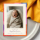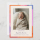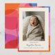 Cette annonce de naissance comporte une photo de nouveau-né sur un fond crème chaud, avec le nom du bébé en écriture manuscrite, la date de naissance, le poids et la taille en dessous. La bordure est un motif abstrait audacieux de formes courbes qui se chevauchent en orange, rose, rouge, violet et bleu — coloré et moderne avec une sensation amusante et joyeuse.