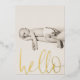 Ceci est un modèle de faire-part de naissance moderne et minimaliste. Sur le devant, il y a un espace pour votre photo de portrait en taille réelle avec une typographie « bonjour » simple et frappante en calligraphie à feuille d'or véritable modifiable. Au verso, il y a un espace pour une photo horizontale, le nom et les statistiques du nouveau-né ainsi qu'un message personnel. Personnalisez facilement ce souvenir unique pour que votre famille et vos amis puissent en profiter pendant des années.