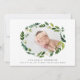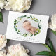D'élégantes annonces de naissance botanique présentent la photo de votre petit-fils (horizontale ou paysagère) entouré d'une couronne ovale de feuillage vert et de fleurs blanches. Personnalisez avec le nom de votre bébé et les statistiques de naissance sous.