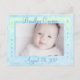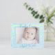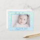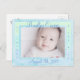 Faire-part de naissance de nouveau-né garçon avec photo avec des bordures bleu clair et vert, nom, poids de naissance, taille et nom du bébé.