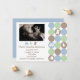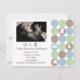 Faire-part de naissance avec photo de point adorable et masculin, parfait pour un bébé garçon. Téléchargez votre photo numérique et ajoutez votre texte personnalisé. Caractéristiques : cercles de couleur bleu poudre doux, sauge et brun sable avec silhouette d'ours en peluche, voiture jouet, oiseau et éléphant. Style super mignon !