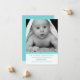 Un élégant carte photo de bébé personnalisé fait en blanc avec un espace photo décoré d'un ruban de pois bleu et blanc aqua, à travers le fond. Idéal pour envoyer à vos amis et à votre famille la première photo de votre nouveau bébé. Le texte aqua personnalisé est prêt à être personnalisé avec toutes vos informations.