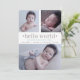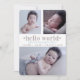 Cette adorable annonce dispose de trois emplacements pour des photographies sur le recto et permet une personnalisation sur le recto et le verso. Le recto indique "hello world" dans une police moderne taupe. Il y a de la place pour deux lignes de texte - à personnaliser ici avec le nom du bébé et les détails de naissance. Remplacez facilement les photos présentées par des photos de votre propre petit amour ! Le verso présente un motif rayé en aqua et taupe doux, traversé par une bannière blanche que vous pouvez personnaliser avec les informations de votre famille ou un autre message personnel. Une façon moderne et chic de présenter bébé à la famille et aux amis.