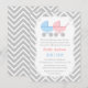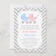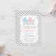 Une invitation élégante et chic pour la future maman qui attend des jumeaux garçon et fille. Elle présente une poussette rose et une autre bleue avec un motif à pois. Fond gris et blanc à chevrons. Personnalisez facilement avec les détails de votre fête.