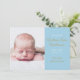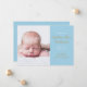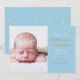 Carte de naissance moderne avec photo de votre bébé garçon, pour présenter votre nouveau-né. Le recto comporte une photo de votre bébé avec un texte chic en or et blanc pour le nom et les informations de naissance de votre bébé sur un panneau bleu que vous pouvez personnaliser à la couleur de votre choix. Le verso présente des étoiles dorées sur des ficelles sur un fond bleu assorti. Conçu par Thisisnotme©