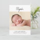 Ce faire-part de naissance photo minimaliste est doté d'une grande photo, d'une typographie de script simple et d'une palette de couleurs noir et blanc sobre. Le devant de la faire-part de naissance comprend le prénom du nouveau-né en écriture manuscrite. Une grande photo est placée sous le nom. Au bas de la faire-part de naissance, ajoutez le nom complet du bébé, la date de naissance, les statistiques de naissance et vos noms. L'arrière - plan gris neutre au dos de la carte peut être modifié. Vous pouvez ajouter des photos supplémentaires au verso de la carte.