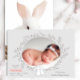 Copyright © 2018 Socialite Designs Inc. & LICENCORS - Cette belle carte photo faire-part de naissance a des lapins de bois sur le devant et une zone photo entourée d'une simple couronne. La couleur arrière - plan est un gris colombe doux. Le dos a des animaux boisés avec un arrière - plan à pois-pois.