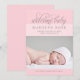 Annoncez l'arrivée de votre bébé fille avec ce faire-part de naissance photo élégant "Bienvenue Bébé". Une écriture calligraphiée fluide de couleur gris pewter chaud se trouve au-dessus d'une bande affichant le nom de votre nouveau-né, sa date de naissance, son poids et sa taille. Un fond rose doux encadre votre photo préférée pour un look intemporel et féminin. La couleur de fond et tout le texte sont entièrement personnalisables pour coordonner avec votre image.