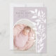 Faire-part de naissance chic et moderne avec une seule photo verticale/orientée en format portrait dans une mise en page en arc, avec des vignes grimpantes de feuilles botaniques blanches le long du côté droit. Personnalisez avec le nom de votre bébé, sa date de naissance et ses statistiques, et ajoutez un message personnel au verso, ainsi qu'une photo supplémentaire.