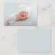 Cette simple petite faire-part de naissance photo présente une simple présentation de typographie blanche du nom et des statistiques de naissance du bébé ainsi que la photo de votre bébé garçon. **TROP PETIT À MAIL en soi, mais parfait pour inclure dans une note de remerciement, un cadeau de remerciement, ou de distribuer à des amis et à la famille. La photo complète saigne sur l'avant et le bleu clair (ou toute couleur que vous choisissez) sur l'arrière. **Le service de design en direct peut vous aider à mettre en page votre design ou vos couleurs si nécessaire.