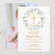 Un décor de guirlandes de verdure et une croix dorée surplombent les informations de votre faire-part de première communion sur ce design élégant.