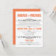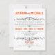 Cartes d'invitation modernes conçues pour les mariages où le couple a un mariage à destination ou une cérémonie de mariage privée restreinte, et n'invite les invités qu'à la célébration de la réception. La typographie sur le devant de ces invitations est conçue avec des polices orange et gris, et le verso est une orange uni avec un texte blanc facultatif pour les informations de RSVP potentielles.