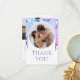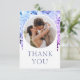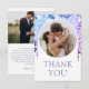 La carte de remerciement de mariage photo aquarelle florale de glycine présente votre photo préférée avec le texte « Merci » dans une typographie violette moderne accentuée de fleurs de glycine aquarelle bleue, violette et lavande. Au verso, ajoutez une photo supplémentaire avec votre message personnalisé. Fait partie d'une collection conçue par Evco Studio www.zazzle.com/store/evcostudio