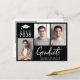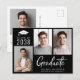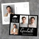 Carte postale de faire-part de remise de diplôme noir moderne avec 3 photos et « Diplômé » dans un script blanc gras contemporain. Ajoutez le nom du diplômé, l'année de promotion et l'école secondaire ou l'université en typographie blanche simple.
