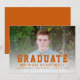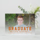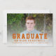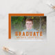 Faire-part de remise de diplôme comportant une photo horizontale personnalisée. Le mot « Diplômé » apparaît en typographie orange brûlé gras avec un look sportif idéal pour l'étudiant-athlète, avec le nom du diplômé, l'école et l'année de remise de diplôme ci-dessous en police sans empattement. Remplacez facilement l'image échantillon avec une photo de votre diplômé. Le verso est en orange brûlé uni assorti. Un bon choix pour la remise de diplôme d'école secondaire ou universitaire.