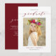 Invitez votre famille et vos amis avec ce faire-part de remise de diplôme personnalisable de la promotion 2023. Il présente une calligraphie fantaisie rouge et une typographie classique. Personnalisez ce simple faire-part de remise de diplôme en ajoutant votre photo, votre nom et le nom de votre école. Ce faire-part de remise de diplôme photo à l'écriture élégante est parfait pour les remises de diplôme de lycée ou d'université.