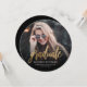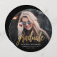 Faire-part de remise de diplôme rond moderne comportant une photo carrée personnalisée. Le mot « diplômé » apparaît en écriture dorée en faux-feuille, avec le nom du diplômé, l'école et l'année de remise des diplômes en dessous en police sans empattement blanche. Remplacez facilement l'image exemple par la photo de votre propre diplômé. Un écran dégradé noir aide à faire ressortir le texte. Le verso est noir uni. Idéal pour la remise des diplômes du lycée ou de l'université.