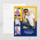Moderne, bleu et or 4-photos collage carte de faire-part de remise des diplômes. Personnalisez avec les photos préférées de votre diplômé et ajoutez leur nom, école et année de remise des diplômes. Utilisez l'outil de conception de Zazzle pour changer les couleurs de fond à vos propres couleurs d'école.