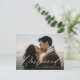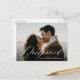 Devez-vous changer la date de votre mariage ? Nos élégantes cartes de report de mariage sont parfaites pour informer vos invités de votre nouvelle date de mariage. La carte de report de mariage comporte "Report" dans un script calligraphique blanc avec votre photo d'engagement horizontale. Personnalisez la carte en ajoutant vos noms, adresse de retour, détails du mariage, site web de mariage, etc.