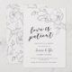 Carte d'annonce de report de mariage élégante et moderne avec une illustration dessinée à la main de fleurs de magnolia de couleur ivoire et grise, accompagnée d'un texte écrit en script qui dit "l'amour est patient"