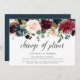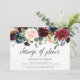 Annoncez votre date de mariage reportée ou reprogrammée avec ces cartes élégantes. L'invitation au "changement de plan" floral et chic présente une bordure supérieure de marsala bordeaux, de fleurs roses et bleues marine, avec un feuillage botanique luxuriant et de la verdure. Personnalisez avec vos détails de mariage replanifiés en écriture manuscrite moderne et en lettres sans serif traditionnelles. Les invitations se retournent vers le bleu marine riche.