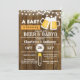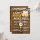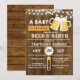 Faire-part de fête prénatale pour l'arrivée de bébé garçon avec un thème de bière et de barbecue sur fond de bois rustique.