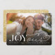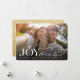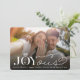 Cette carte moderne et élégante d'annonce de fiançailles pour les fêtes de Noël / faire-part "save the date" présente le mot "Joyous" dans un mélange de caractères serif classiques et de calligraphie fantaisiste avec le monogramme du couple intégré dans un motif de bague en diamant unique superposé sur une photo en plein cadre.