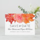 Faire-part de mariage de sauvegarde de date de l'hibiscus orange pour un thème tropical hawaïen. Trois fleurs d'hibiscus exotiques de rose foncé, rose clair et orange font une large bordure en haut de cartes blanches avec du texte noir avec de l'espace pour inclure les noms complets du couple.