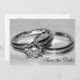 Annoncez vos prochaines noces avec l'élégant faire-part de tenue de mariage avec ensemble de bague en diamant. Cette carte de faire-part de mariage personnalisée et élégante présente une photographie en gros plan améliorée numériquement d'un anneau de fiançailles en diamant et d'un ensemble de bagues de mariage avec un fond gris.