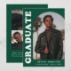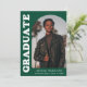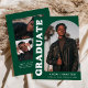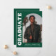 Faire-part de remise des diplômes élégant et branché avec la photo du diplômé sur le devant avec un cadre photo en arc décalé. "Graduate" est affiché en gras blanc rétro lettrage sur un arrière - plan vert. Personnalisez l'avant du faire-part de remise de diplômes en photo en ajoutant le nom du diplômé, son école et son année de remise de diplômes. La carte s'inverse pour afficher 3 photos supplémentaires avec espace pour le texte personnalisé comme les futurs plans de collège, plans de carrière, détails de la fête de remise des diplômes, etc. Le faire-part de diplôme vert est parfait pour les diplômés du secondaire et du collège.