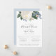 Arrangement floral aquarelle dans des tons de blanc, rose, bleu et vert, invitation au dîner de répétition. Design de typographie grise chic et moderne. Le dos de la carte présente une couleur bleu poudre clair uni.