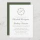 Cette élégante conception de faire-part de mariage présente un monogramme initial de script de couleur vert olive encerclé par une couronne botanique d'art linéaire sur fond blanc. Les noms apparaissent en script de couleur vert olive, le reste du texte étant en police serif classique. Le dos de la carte est de couleur vert olive uni.