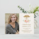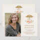 De belles et charmantes annonces et invitations de photo de remise de diplôme de faculté de médecine florale avec un design de caducée doré avec un aspect aquarelle, un design de rose et de pivoine vintage rose et pêche dans des tons et des motifs jolis et pâles de vert, de crème et de parchemin. Ajoutez votre photo préférée du récent diplômé de la faculté de médecine sur ces annonces et invitations de remise de diplôme shabby chic. Vous pouvez remplacer le MD par les initiales du diplômé ou un autre titre médical professionnel si vous le souhaitez. Conçu par Chrissy H. Studios, LLC. Tous droits réservés.