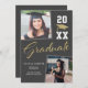 Annoncez la grande réussite de votre diplômé grâce à ces annonces de diplôme modernes comportant deux photos. Customisez la date de sortie avec votre propre couleur et police. Ce design présente des accents de faux or. Des détails et des photos supplémentaires peuvent être ajoutés au dos, y compris les détails de la fête.