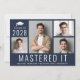Carte de annonce de graduation en maîtrise moderne avec fond bleu foncé comprenant un collage de 4 photos, "J'ai réussi" écrit en grandes lettres blanches et l'année de promotion du diplômé, son nom et son école ou université en typographie blanche simple. Au verso, ajoutez une photo supplémentaire et un message personnalisé.