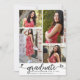 Soyez fiers, réjouissez-vous et mettez en valeur cette étape importante pour votre diplômé préféré ! Envoyez cette annonce de collage de 4 photos personnalisée, girly, époustouflante, simple et moderne pour un événement inoubliable. Un visuel amusant et ludique avec une écriture manuscrite en noir et des cœurs mignons et ludiques, ainsi que son nom, son année de promotion, et son école et 4 photos de votre choix se superposent sur un fond blanc impeccable. L'écriture noire, les cœurs et le texte sans empattement se superposent sur un fond blanc au verso. Personnalisez le texte personnalisé avec le nom de votre diplômé, son école et son année de promotion sur le devant. Au verso, ajoutez votre note personnelle, la prochaine école qu'elle fréquente, etc. Les invitations, les cartes de remerciement, les décorations de casquette, les serviettes, les assiettes et d'autres cadeaux de fin d'études assortis sont également disponibles dans cette collection tendance et élégante