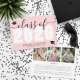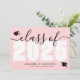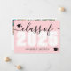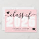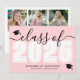 Une annonce de remise de diplômes horizontale classique et moderne. Le devant présente un « Promotion 2026 » surdimensionné en noir et blanc gras, avec l'année en blanc net sur un fond rose poudré. Des accents d'écriture noire élégants et deux icônes de chapeau de diplômé noir ajoutent une touche de célébration, avec un espace en dessous pour le nom du diplômé et de l'école. Les couleurs peuvent être personnalisées pour correspondre aux couleurs de l'école pour un look personnalisé.