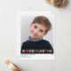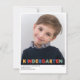 Élégant faire-part de fin d'études de jardin d'enfants. Grande photo centrale avec en-tête superposé des lettres de couleur mixte. Typographie et composition minimalistes modernes. Sophistiqué et jeune. Gardien formidable faire-part d'une étape spectaculaire dans son parcours éducatif.