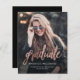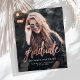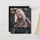 Faire-part moderne de graduation avec une photo verticale personnalisée. Le mot "diplômé" apparaît dans le script rose de faux feuille d'or, avec le nom du diplômé, l'école et l'année de graduation en bas en blanc sans serif police. Remplacez facilement l'image de l'échantillon par la photo de votre diplômé. Un écran de dégradé noir permet de s'assurer que le texte s'affiche. L'inverse est noir. Idéal pour obtenir un diplôme d'études secondaires ou collégiales.