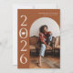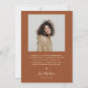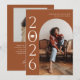 Carte de faire-part de remise de diplômes design et moderne à envoyer à la famille et aux amis. Il y a une arche en terre cuite autour de votre photo. Vous pouvez ajouter une deuxième image au verso et le message est modifiable. L'année est écrite sur le côté avec une illustration d'un plafond de graduation à l'intérieur du nombre zéro.