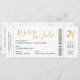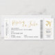 Tarjeta de embarque Tarjetas de boletos de avión Save the Date en Español. Personnalisez votre voyage thème destination mariage enregistrer la carte d'embarquement date avec un avion romantique en or avec un coeur.
